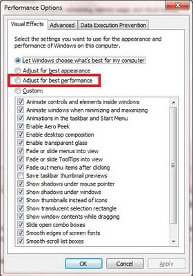4º passo: Clique em "Adjust for best performace" (Ajustar para melhor desempenho). Clique em "OK" em tudo o que está aberto.